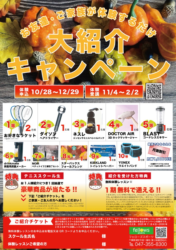 ■別部門在籍者様(サッカー・ダンス・ゴルフ)が紹介者の場合、紹介者様は抽選対象外。紹介された方は1期無料体験入会が可能です