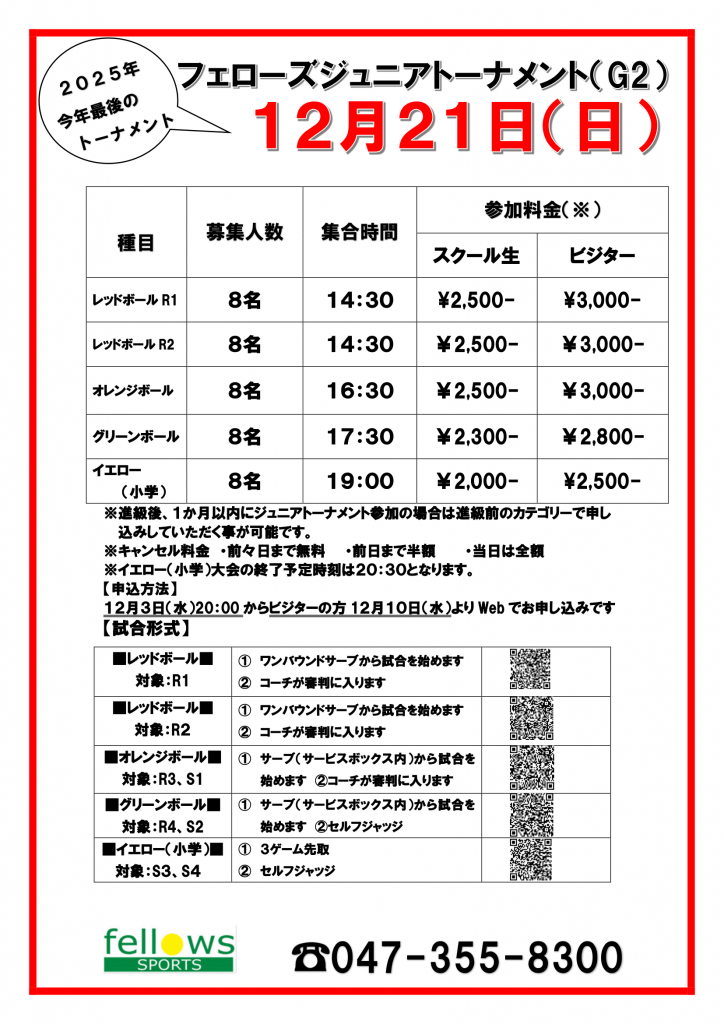 12月21日(日) Jr.トーナメントを開催いたします! フェローズ総合 テニス浦安 2025年11月29日 お申込 スクール生は12/3(水)20:00~ ビジター様は12/10(水)~ 下記よりお申込みください! レッドボール【R1】 レッドボール【R2】 オレンジボール グリーンボール イエローボール【小学生】 お申込お待ちしております!