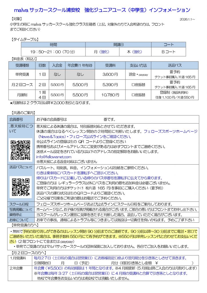 FUTSAL INFORMATION 強化ジュニアユース サッカー 2016年1月22日 【2026年4月期より規約変更について】 欠席のご連絡および振替予約はすべてWEBでの対応となります。 PDFでご覧になる方はこちら