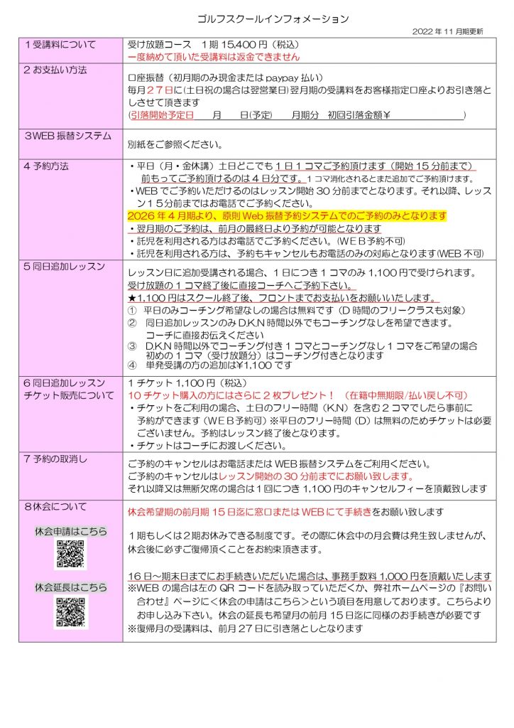【2026年4月期より規約変更について】 欠席のご連絡および振替予約はすべてWEBでの対応となります。